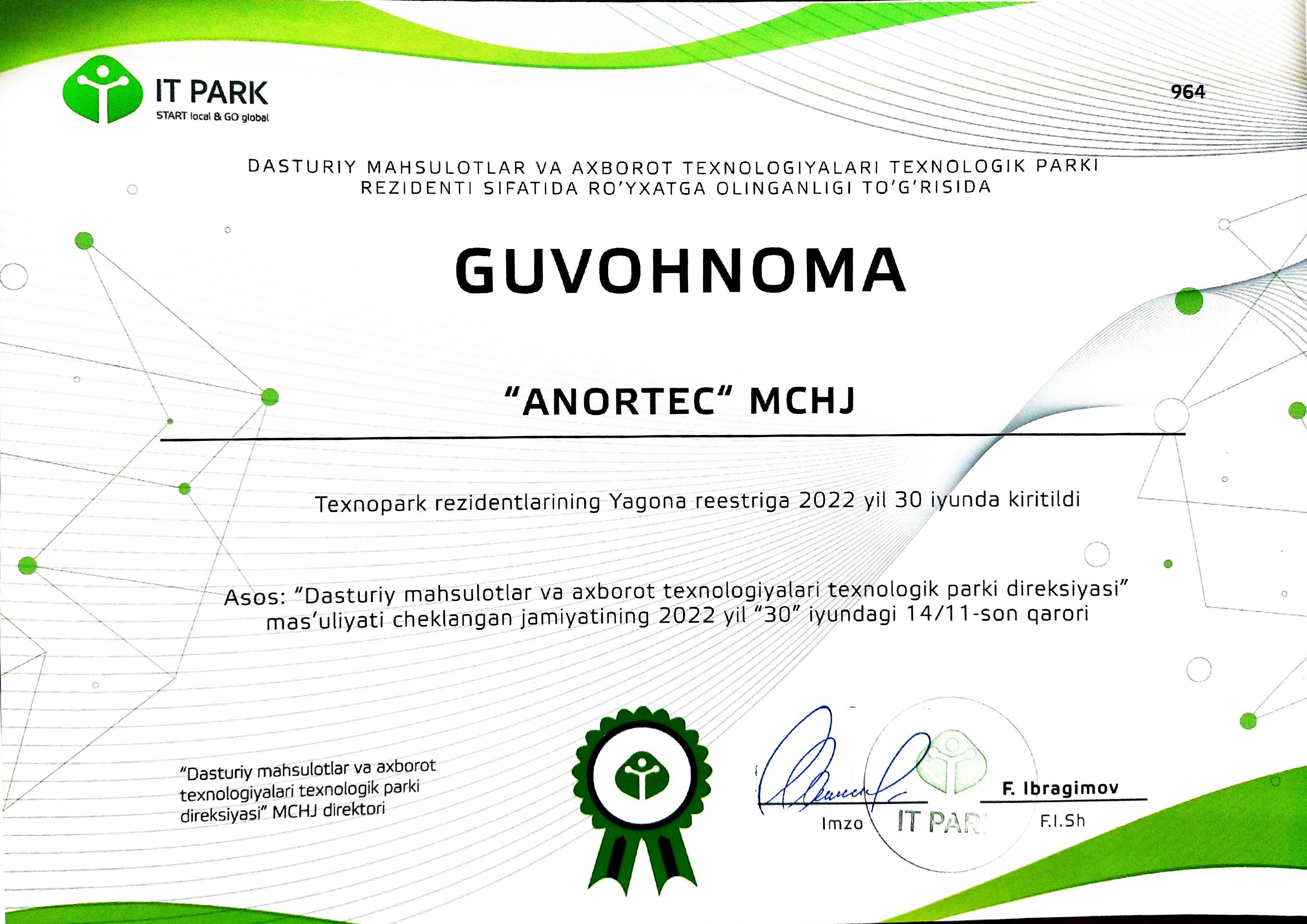 ООО «ANORTEC» - резидент IT-парка РУз, деятельность компании обеспечивает всю технологическую цепочку от проектирования, разработки, реализации и технического сопровождения комплексных решений по кибербезопасности критических инфраструктур и организаций; доработку и модификацию программного обеспечения; разработку и внедрение автоматизированных систем управления; аудит информационных систем; обучение, подготовку и повышение квалификации специалистов по информационной безопасности.